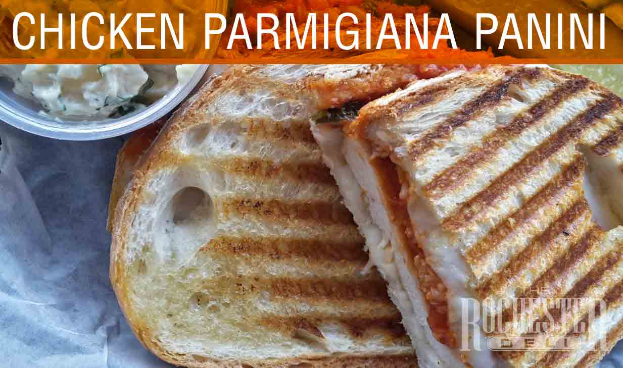 Chicken Parmigiana Panini: Egg breaded Chicken breast, mozzarella, parmesan and our signature marinara sauce grilled on Vienna.